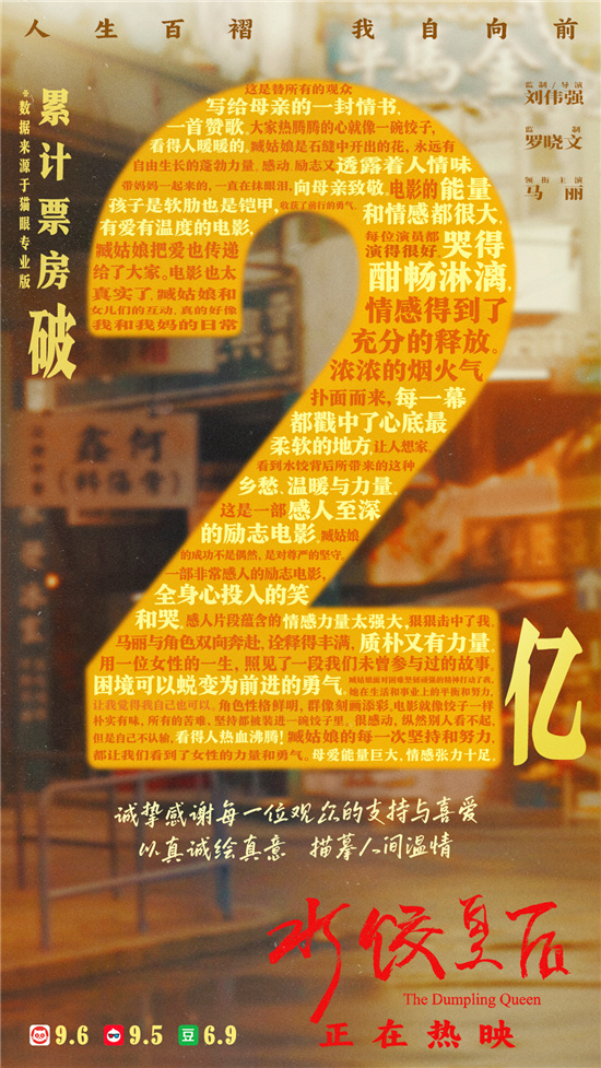 1905电影网讯 据猫眼专业版数据,影片《水饺皇后》上映6天,总票房破2亿。影片由真人真事改编,刘伟强监制、执导,罗晓文监制,马丽领衔主演,惠英红、朱亚文友情特别出演。
