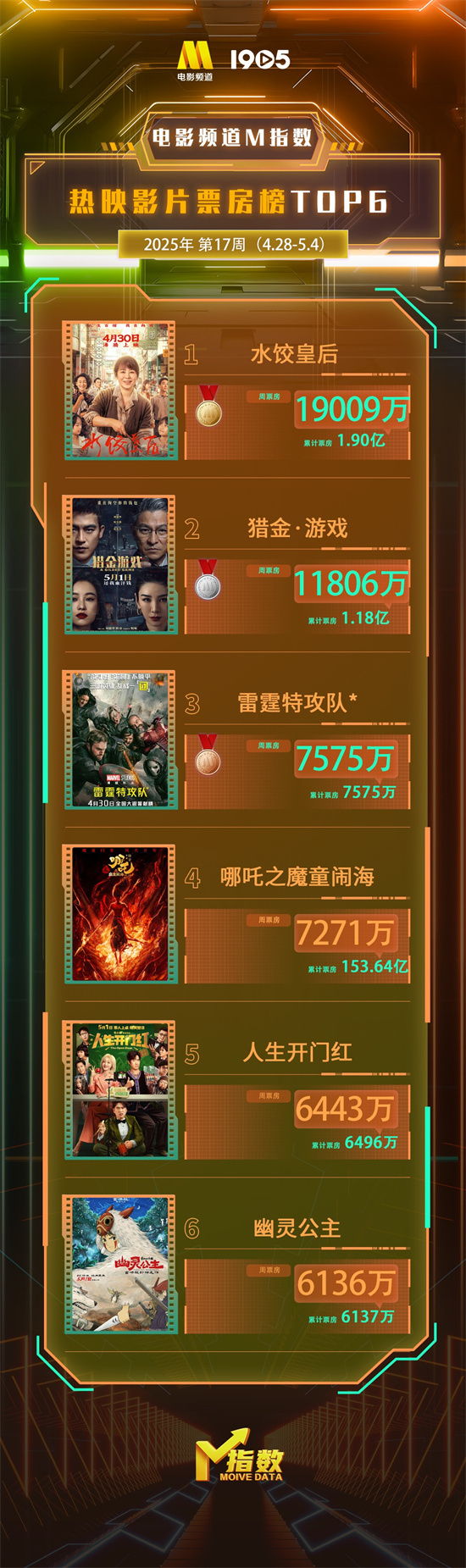 1905电影网讯 “电影频道M指数”2025年第17周结果发布。4月28日-5月4日,“电影频道M指数”热映影片票房榜前6位依次为: